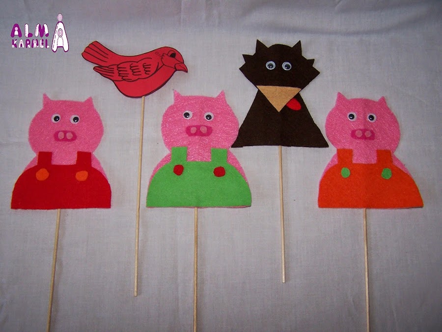Para la puesta en escena hemos preparado unas marionetas, sencillas, pero muy resultonas, el lobo feroz, los 3 Cerditos y Petirrojo, un pajarito, amigo de los cerditos....