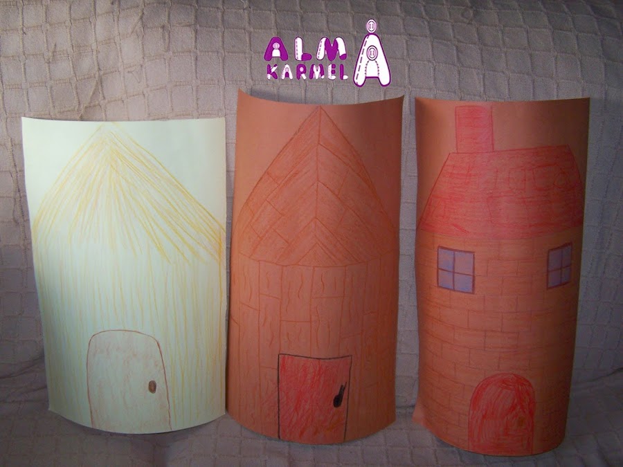 Y las 3 casitas, en cartulina, la de paja, madera y ladrillo. ya que así son fáciles de derribar... el peque las coge y las lanza hacia atrás, jajajja.