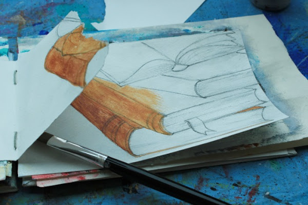 En este libro, siempre comencé cada página con un boceto a mano alzada que podía ser o no el resultado final porque el boceto terminaba escondido en las primeras capas de pintura, esta vez decidí no perderlo y lo remarqué bastante con el lápiz