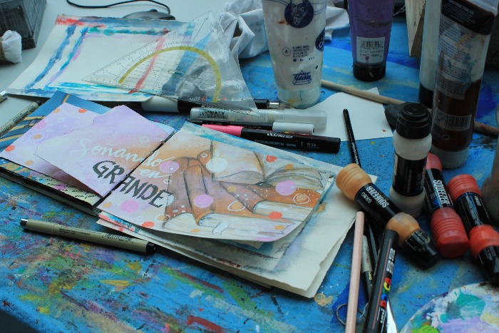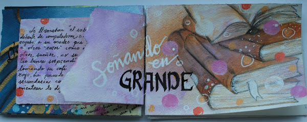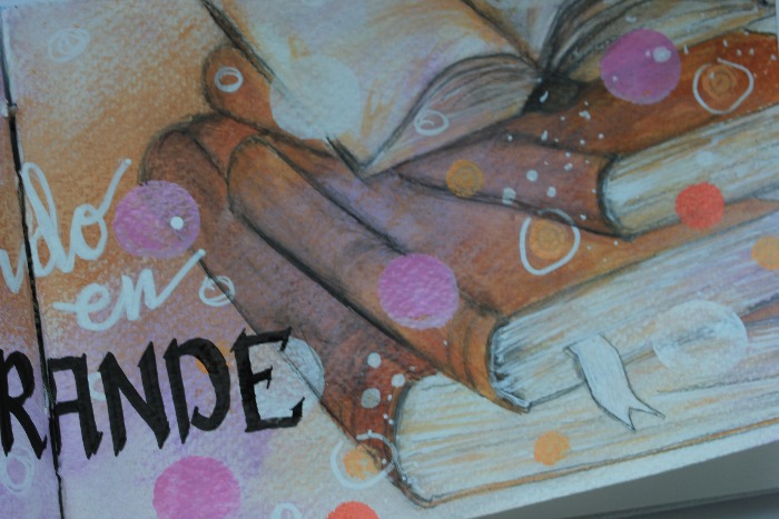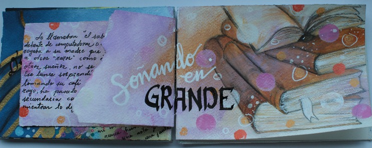 Cada página tiene prácticamente los mismos materiales: Acrílicos, carboncillo, rotuladores (marcadores), tintas... Una verdadera página mixed media!