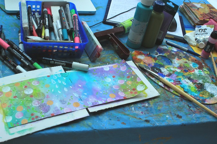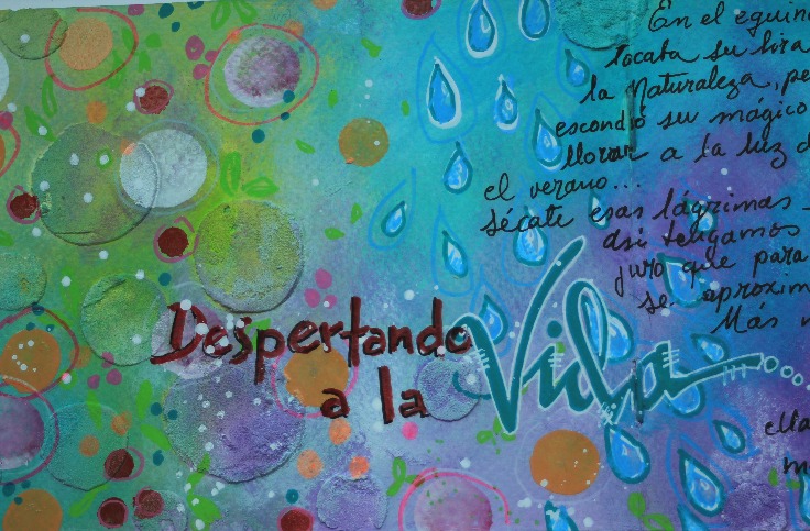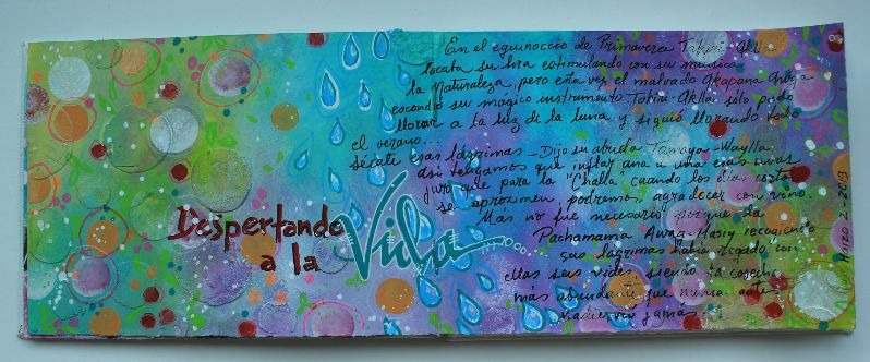 Lidia nos pide hacer un cuento con máx. 100 palabras basándonos en la lámina, en el dado y adicional debe llevar "equinoccio de primavera". Para mi página, ya lo sabes, no ilustro mi relato, me inspiro y hago mi página mixed media, en esta ocasión decidí irme por los mismos tonos de la lámina.