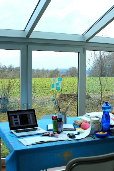 Que rico, unos tonos bien frescos, bien primaverales, verde, azul, lila... bueno, lila más bien va por mi relato, por las uvas maduras al final del ciclo...