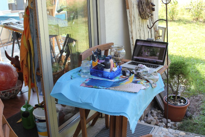 Por esas épocas de estudiante tenía una mesa un poquitín más grande que ésta... afuera de mi taller se está muy bién, con un poco de brisa, el piar de los pájaros... y con dos o tres cosas mi mesita se desborda!! (jajaja)