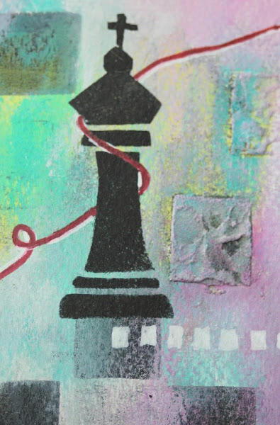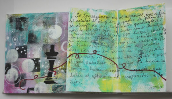 Escribí la historia a mano en la página siguiente, la foto no ayuda, pero los tonos son los mismos, sin el tablero de ajedrez ni el magenta, pero se une con el hilo rojo que continúa...