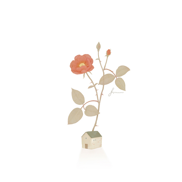 Sobre fondo crudo, solapa en pico, color natural con ramilletes de florecillas rojas y amarillas.
