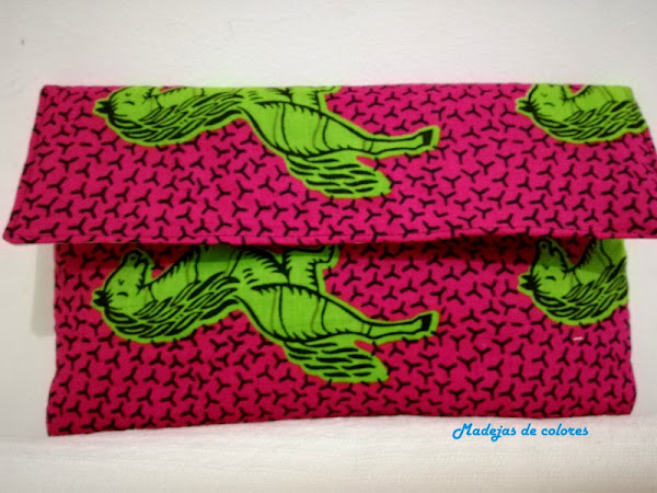 Con una tela original y llamativa africana, con caballos verdes, sobre fondo fucsia.