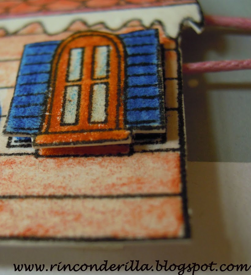 La casa es un sello de "Hero Arts® Snowy house" que está coloreada con lápices acuarelables y el muñeco de nieve es un sello de "Personal Impressions® Christmas", del que el gorro y la bufanda también están coloreados con lápices acuarelables.