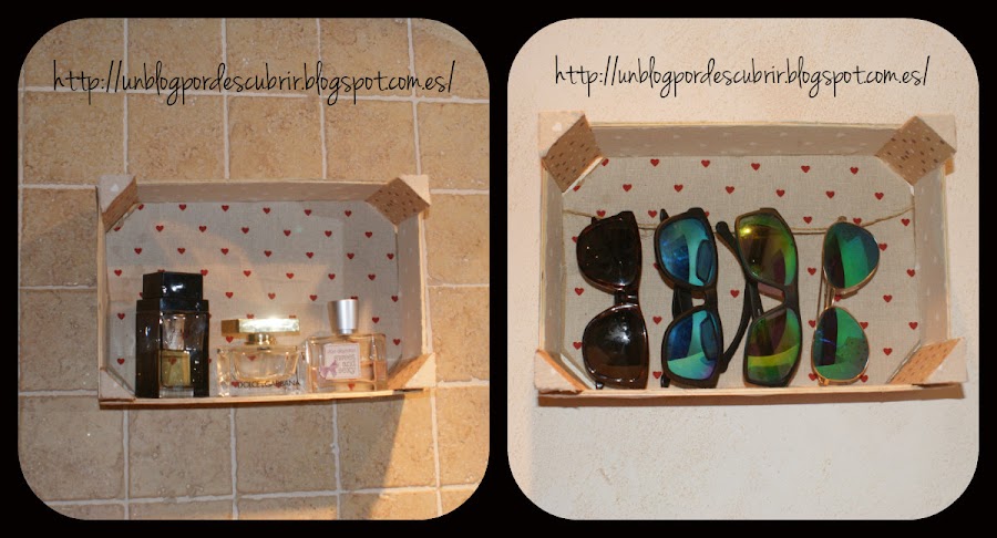 Cuando la tengas lista, solo te quedara buscarle una ubicación, yo en un principio pensé en ponerla en el cuarto de baño, para poner los perfumes, pero al final opté por otra opción. No se vosotras, pero yo tengo unas poquitas de gafas de sol (no se salir de casa sin ellas), y nunca se donde colocarlas, así que decidí poner una cuerda de lado a lado de la caja, anudándola por la parte trasera, y el cuerda colocaré las gafas.