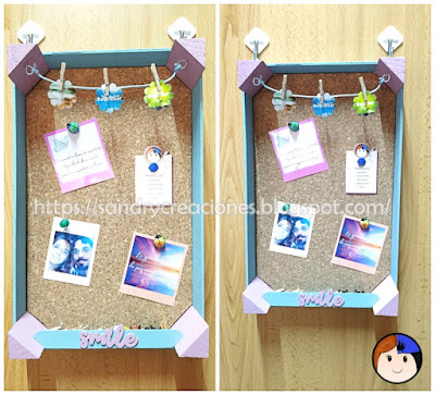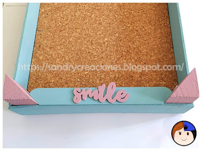 Para decorarla nosotros le hemos puesto una pequeña barandilla ajustando un palo de helado en lo que sería la base de nuestro panel con una palabra de madera "smile" (sonríe) para que no se nos olvide nunca sonreír. El uso de esta pequeña barandilla es por si queremos utilizar el panel como estantería para pequeños objetos, como por ejemplo: chinchetas, pinzas, clips, etc.. y de esta forma no se caigan.