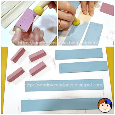 Paso 3. Decorar las piezas de la caja. Ya que tenemos la caja desmontada aprovechamos para pintar sus piezas antes de volver a montarla ya que así nos ira mejor. En el caso que no la hayáis desmontado podéis proceder a pintarla y decorarla igualmente. Para decorarla nosotros decidimos utilizar 2 colores de pintura a la tiza, un color azul para sus lados y un color rosa para las esquinas, que aplicamos con ayuda de una esponja para darle una textura menos lisa. Utilizamos este tipo de pintura porque cubre mucho y apenas hace falta aplicar una segunda capa, así como tampoco precisa de imprimación, pero podéis utilizar la pintura que os vaya mejor.