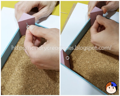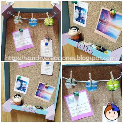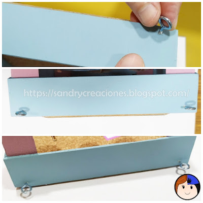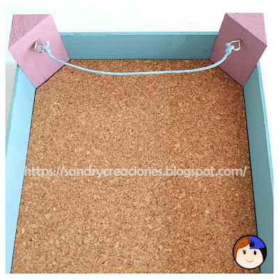 Además hemos puesto un par de hembrillas en las esquinas de la parte superior de nuestro panel en el que hemos atado un hilo para poder colgar fotos o lo que queramos con pequeñas pinzas.