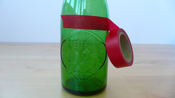 Lo primero que hacemos es limpiar cada botellín, escoger los colores, el diseño y con washi tape o cinta de carrocero vamos marcando las distintas zonas que queremos pintar.