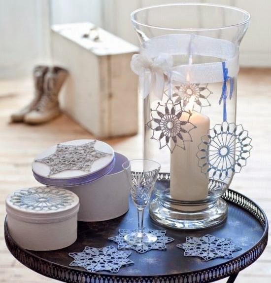 Hola amigos,seguimos con un torbellino de inspiración Navideña,ojala y les este gustando todos los adornos navideños que estamos haciendo,sé que tengo muchas amigas que les gusta tejer y para ellas les traigo está bonita idea,son copos de nieve navideños tejidos a mano,si te gusta el crochet,ve por el gancho y la madeja de hilo o estambre,y comienza a tejer muchos copos de nieve,estos te servirán para decorar de muchas maneras,en la primera foto veras que los copos de nieve tejidos pueden usarse como adornos para el arbolito de navidad,pero también pueden ser posa vasos,caminos de mesa,guirnaldas para colgar en las ventanas o en la entrada de la casa.