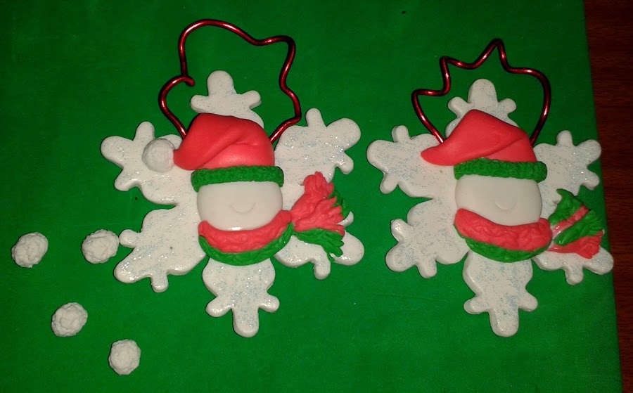 Para su realización, utilicé los siguientes materiales y herramientas: Masa Flexible o Porcelana Fría de los colores: blanca, verde, roja y naranja. Pega o cola blanca. Gel escarchado. Rodillo. Cortadores en forma de Copo de Nieve. Alambre de color rojo. Estecas o estiletes. Rodillo, tijera, cepillos y cortador de alambre (herramientas de bisuteria).