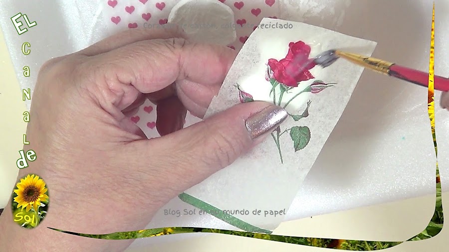 Pegamos la servilleta para decoupage que hayamos escogido, dejando como ya sabemos la primera capa delgada que tiene el dibujo, esto lo podemos sustituir con cualquier dibujo que nos guste de una revista