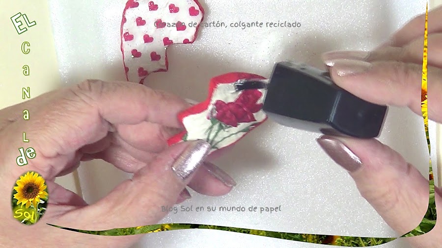 Delineamos las orillas con pintura roja, cuando haya secado aplicamos el barniz y la diamantina tornasol en ambas caras