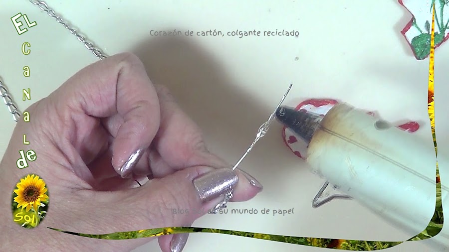 Ya bien seco nuestro corazón, colocamos los postes y las arandelas sobre la cadena, con la aguja gruesa perforamos, metemos el poste con algo de silicón del que tengamos