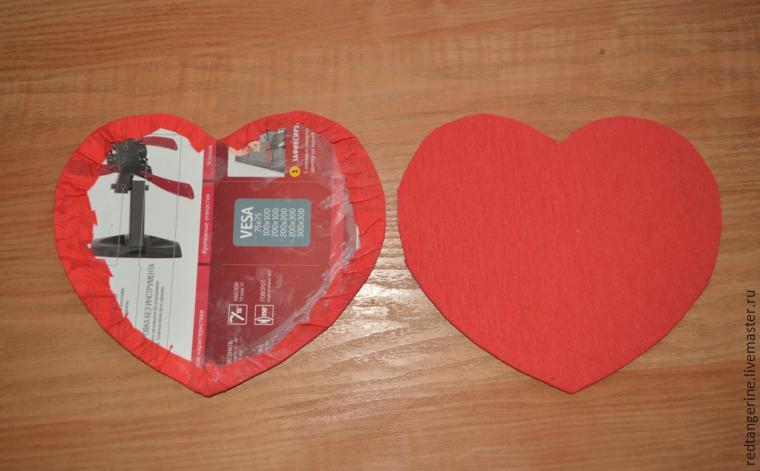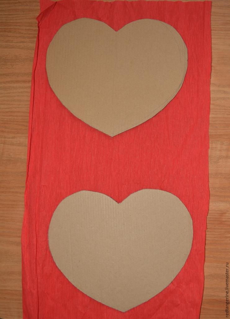 Con pegamento escolar para papel pegamos cada corazón a papel crepé rojo. Los recortamos dejando 1 cm alrededor, luego pegamos el papel crepé sobrante hacia otro lado del corazón y juntamos con un pegamento fuerte las dos cartulinas.