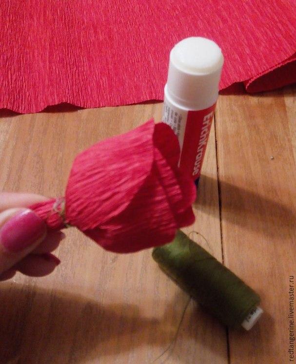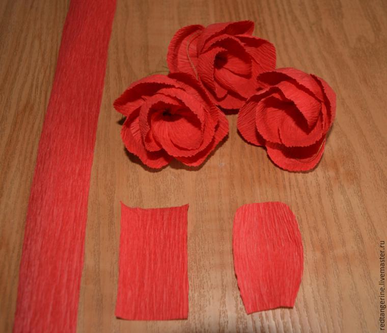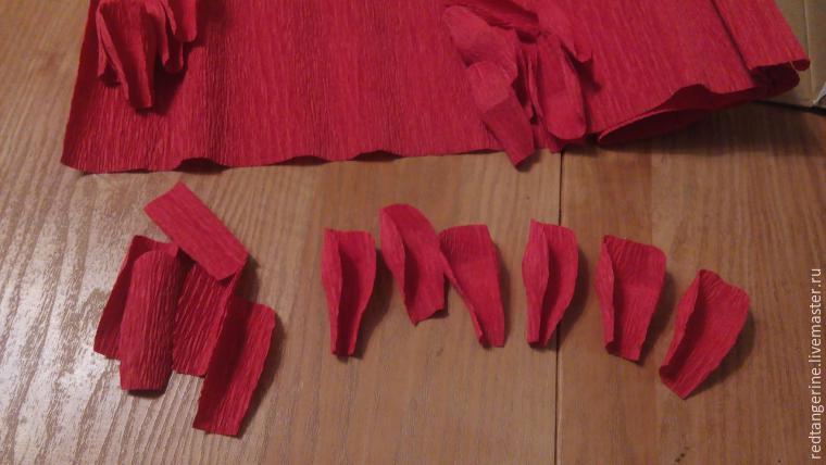 Para los pétalos recortamos tiras de papel crepé de 6 cm de largo y 4 de ancho. Papel debe estirarse horizontalmente en el ancho del pétalo. Redondeamos la parte superior de cada rectángulo.