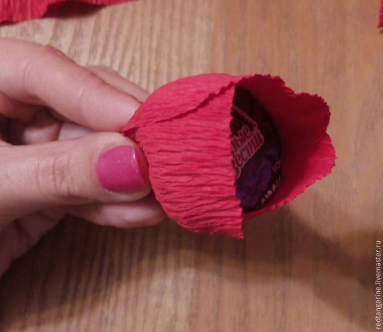 Para formar las rosas vamos a pegar los pétalos alrededor del bombón de chocolate. La parte inferior del pétalo en esta técnica se fija con un hilo.