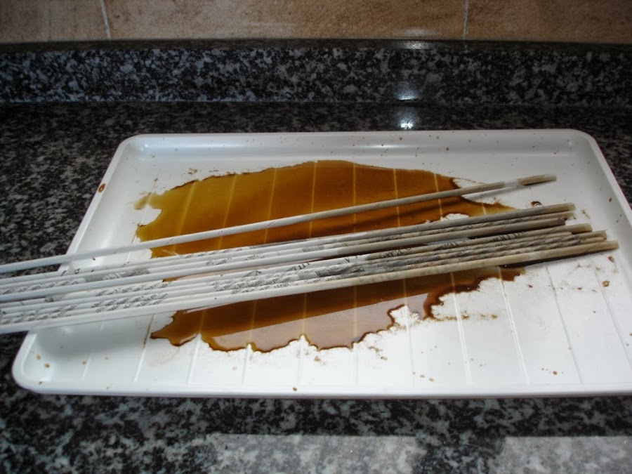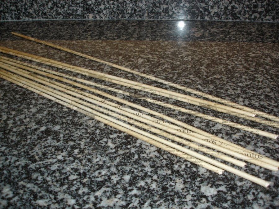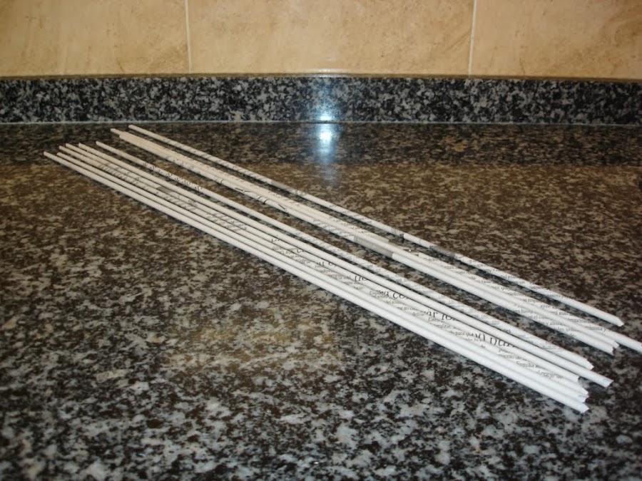 Hice varios rollitos de periódico con ayuda de un palito de brocheta y los teñí con café para darles un aspecto envejecido.