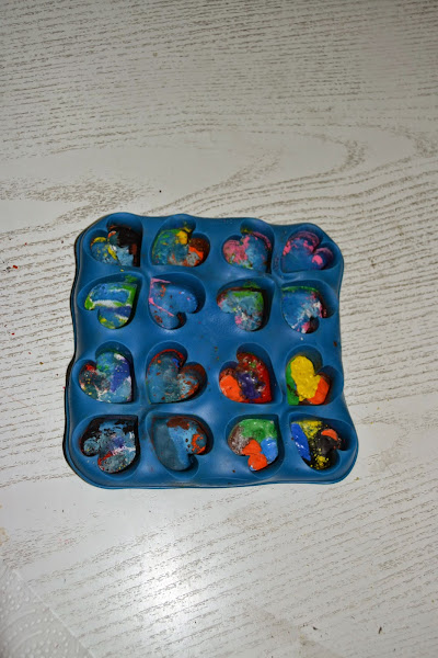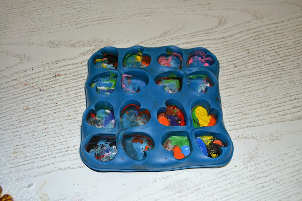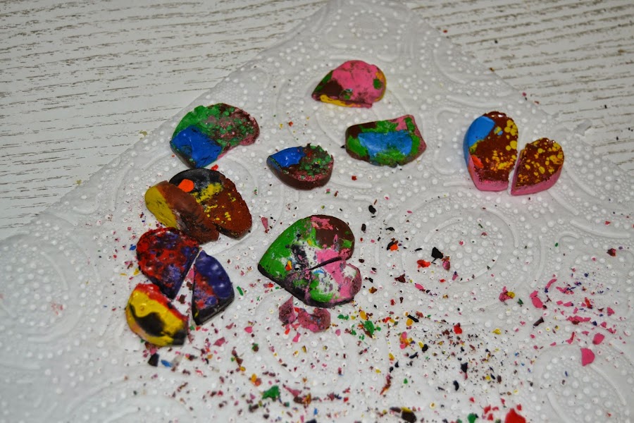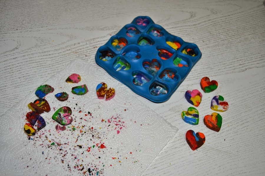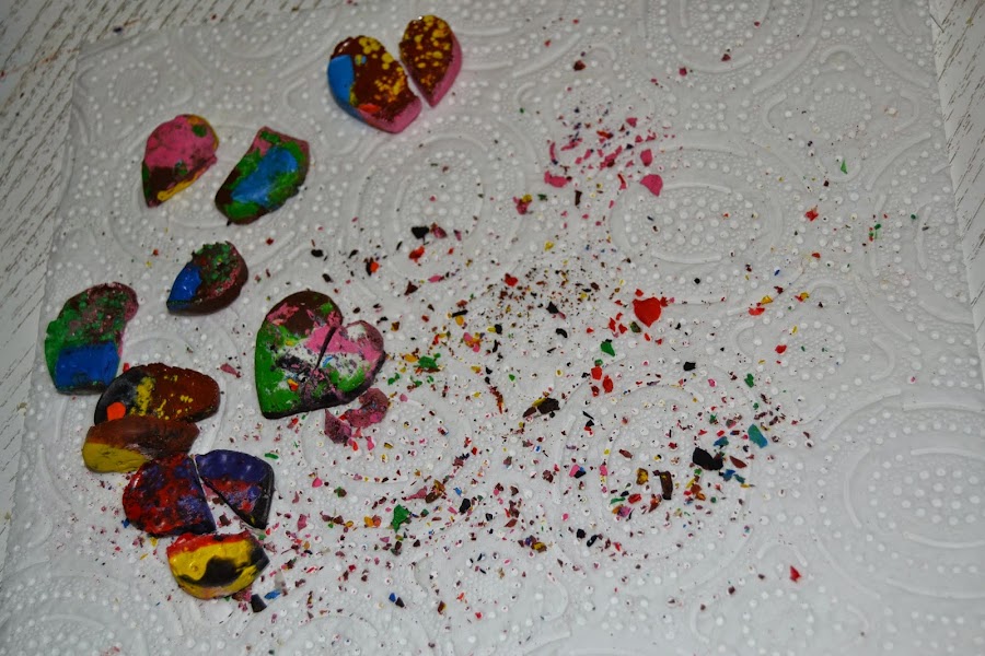 Puse en cada corazón cuatro, cinco e incluso en algunos seis trozos de pinturas de cera de diversos colores y tamaños, sin preocuparme mucho por la combinación de colores, ya que no tenía muchas esperanzas en que saliera bien el experimento.