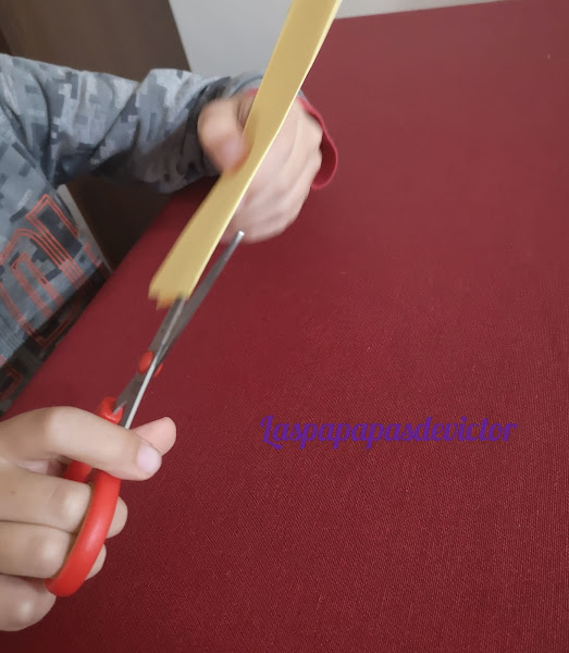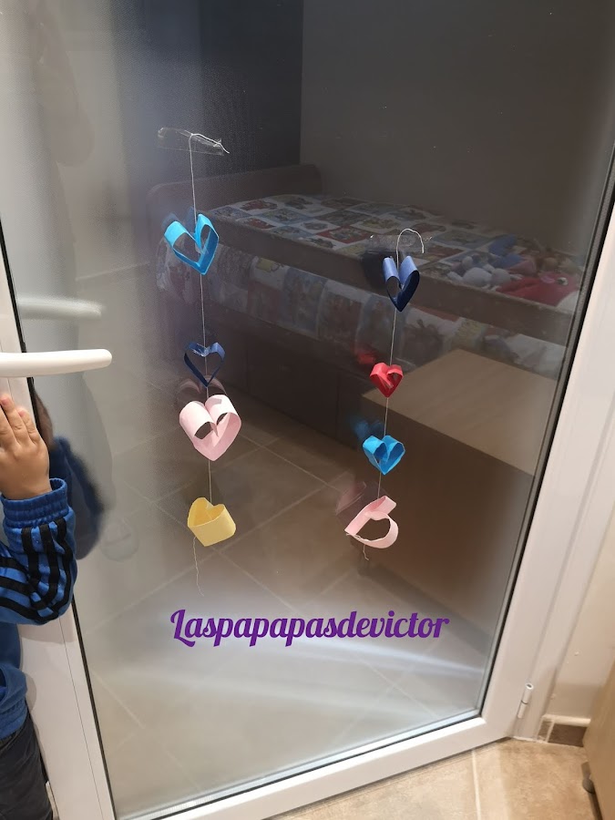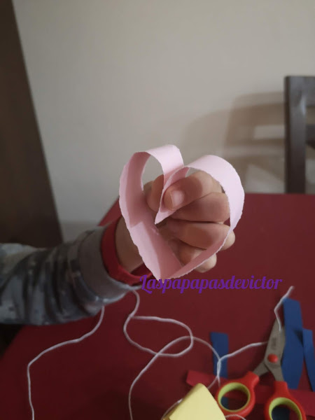 Con una aguja y cuidado, aquí habrá que pedir ayuda a un adulto... Ensartar de un extremo al otro de los corazones de cartulina