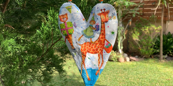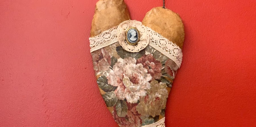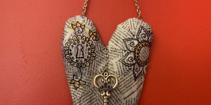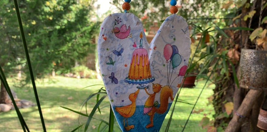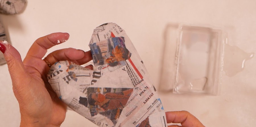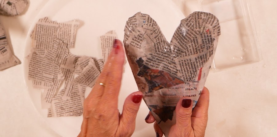 Este es otro corazón cuya mano de cartapesta se la di con papel de diario, queda ya con una sola capa muy firme.