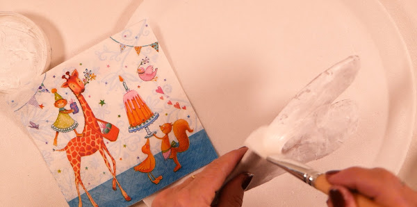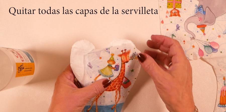 Cuando se secó le voy a hacer un decoupage con ésta servilleta. Recorto el dibujo que quiero en este caso la jirafa y la presento sobre la pieza para ver su ubicación .