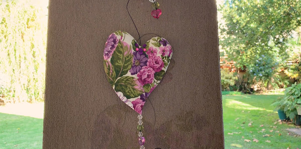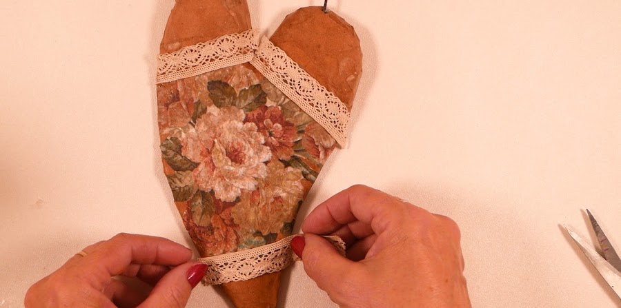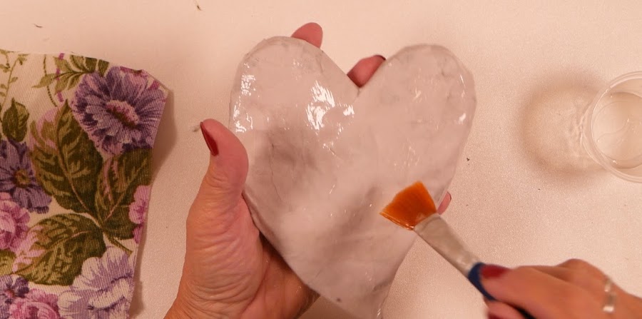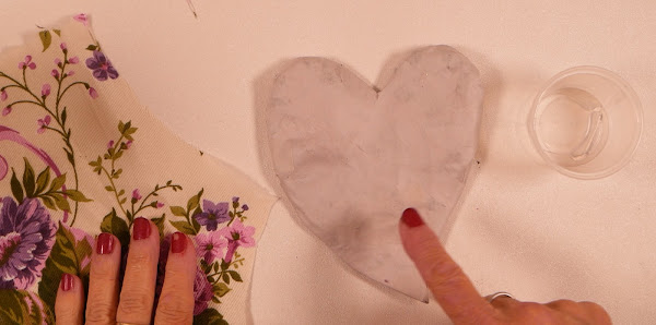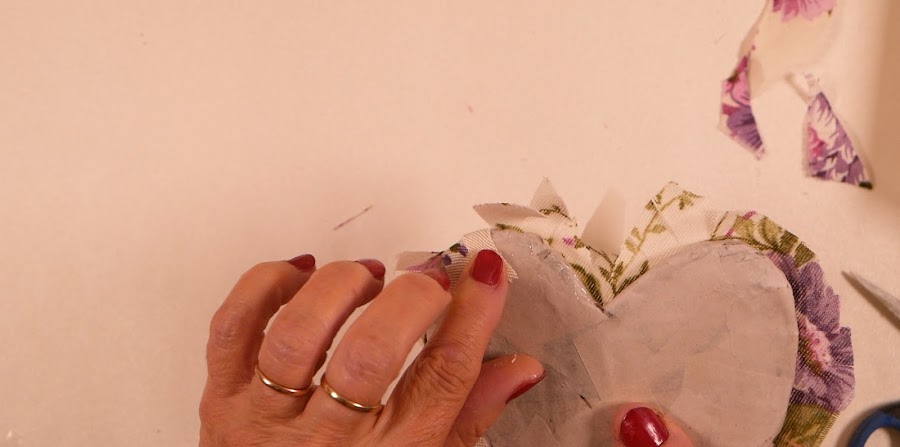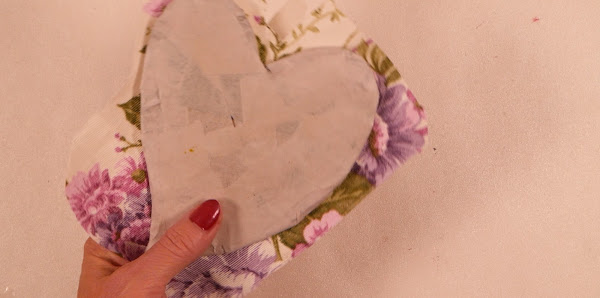Sobre éste otro corazón con forma distinta al anterior le di cartapesta con un color liso y blanco. A este le voy a hacer un decoupage con una tela, recorto un trozo de la misma y como ésta es gruesa la pegaré con pegamento de silicona rebajado un poco con alcohol medicinal para que se adhiera mejor.