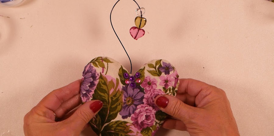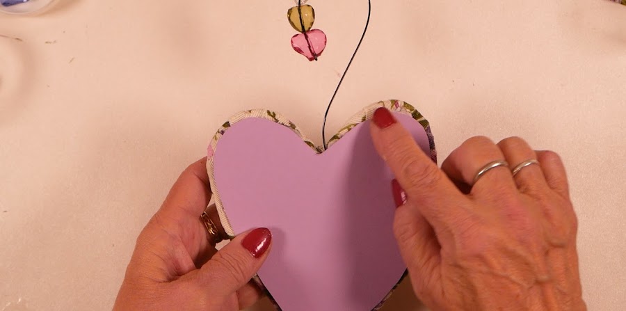 Doy vuelta la pieza y sujeto este alambre con pegamento y cintas de papel y dejo que el alambre sobresalga por debajo del corazón.
