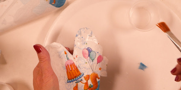 En la parte de atrás también le realizo otro decoupage aprovechando otro de los dibujos de la servilleta acomodándola de manera tal que con trozos de la misma simule un dibujo completo.