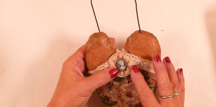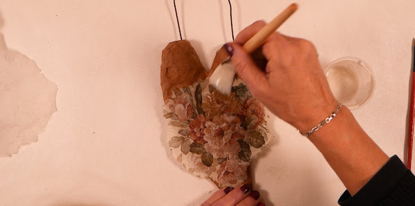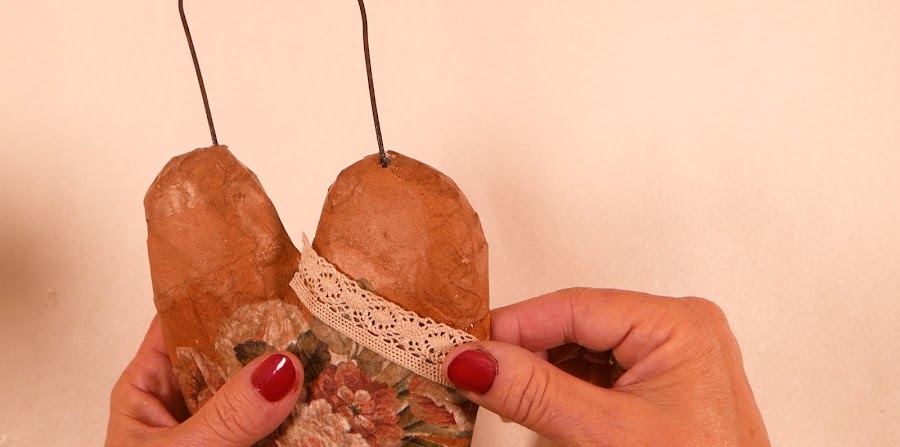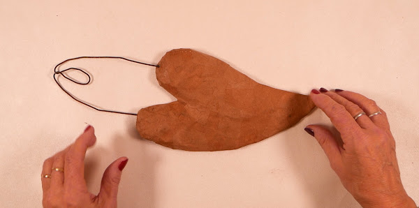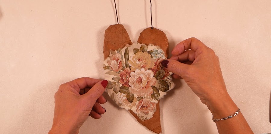 Este último corazón lo cubre también con papel de color madera, en la parte de atrás le pegue un corazón entero para tapar las imperfecciones y le clavé directamente en la cartapesta un alambre viejo que tenía, le hice una vuelta de adorno en la parte superior y lo dejé de manera muy rústica.