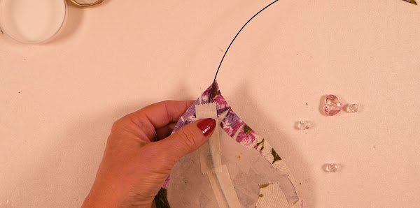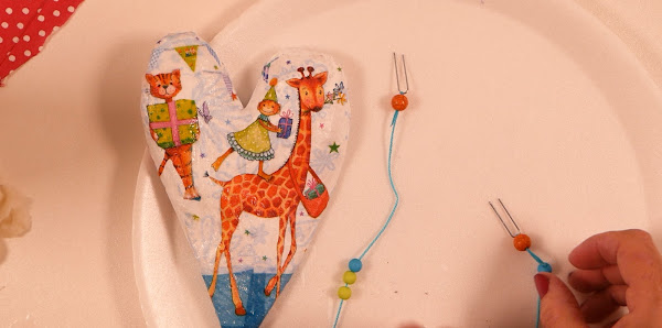 Para colgarlo elegí un hilo al tono y unas cuentas de colores semejantes al motivo de las servilletas.