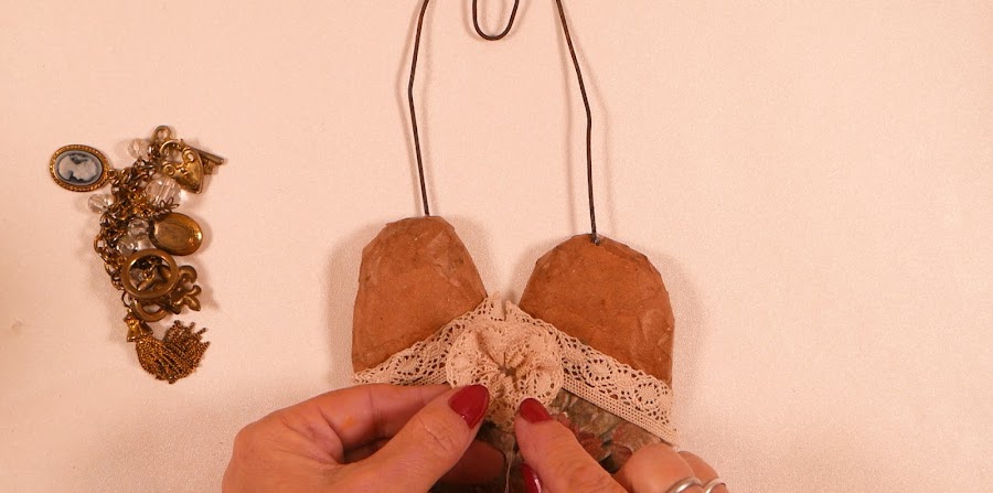Con la misma puntilla y aguja e hilo hice un círculo y elijo un camafeo que saco de una pulsera que ya no uso y lo pego en el centro con pegamento de silicona.
