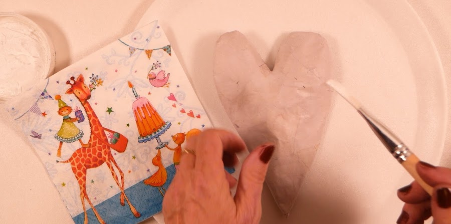 Apoyo la servilleta y la pego, en la parte inferior realizo un corte para acomodar las patas de la jirafa y con otros trozos de servilleta relleno todo el frente del corazón.