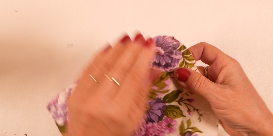 Aplico el pegamento de a poco y voy doblando la tela hacia adentro presionando con las manos para que se pegue bien.