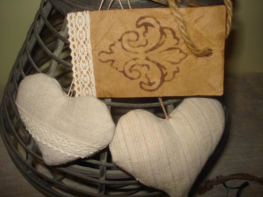 Unos pequeños detalles: unos corazones de tela y unas etiquetas de ropa decoradas.