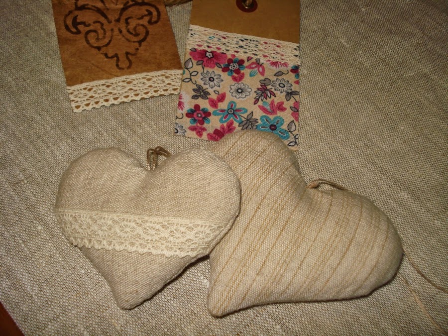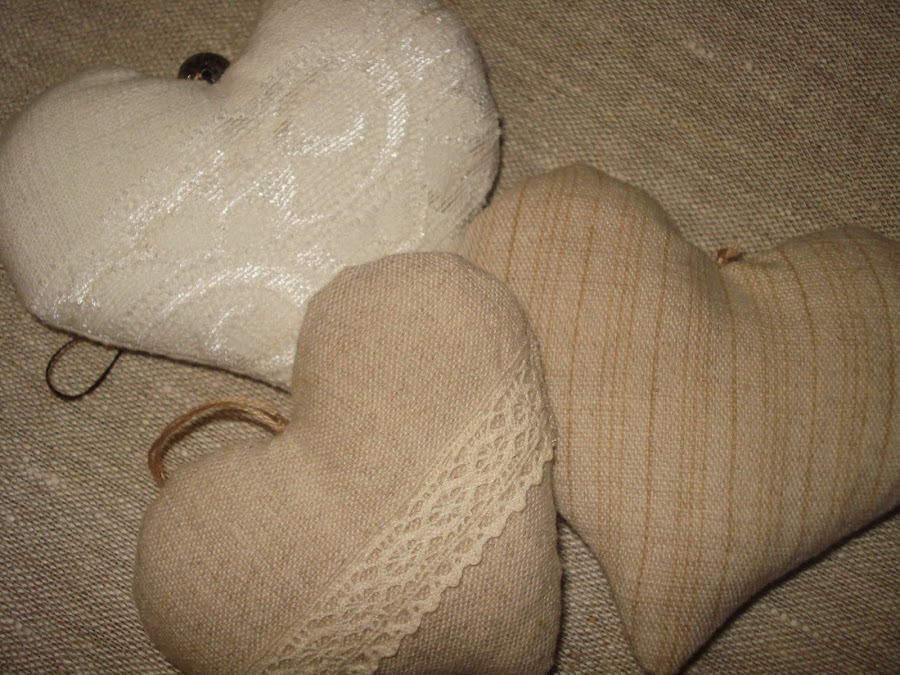 La tela que usé para hacer los corazones son de unos dos pantalones de lino que ya no usa mi marido, así que puedo hacer figuras de tela para aburrir.