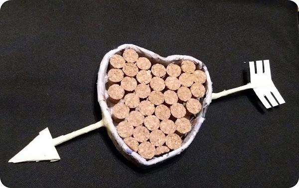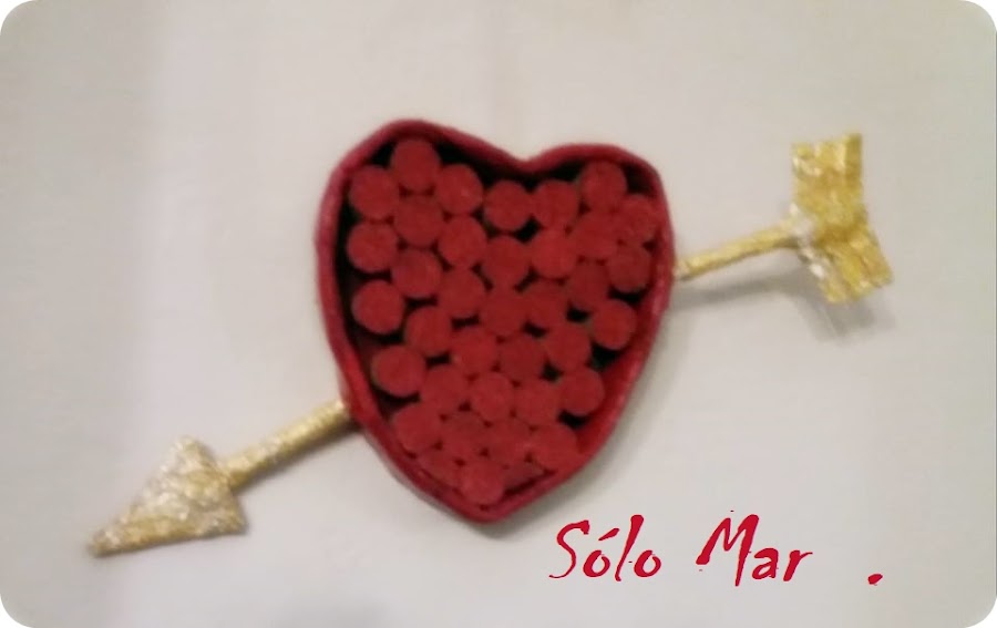 Con una varilla y unos pequeños trozos de cartón hago la flecha , cartapesta para endurecer , la corto por la mitad y se la pego con silicona caliente a los laterales del corazón.
