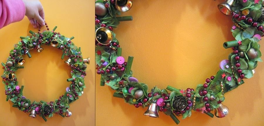 Así que hemos aprovechado cuentas y adornos como en la primera corona, y también una cadena con campanas para darle mayor toque navideño :)