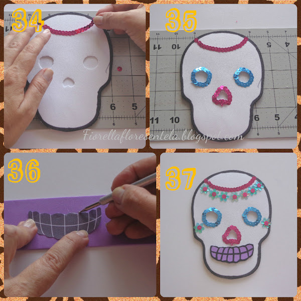 37. Con tu imaginación y las lntejuelas o botones en forma de flor decora la calavera para darle un toque mas alegre.