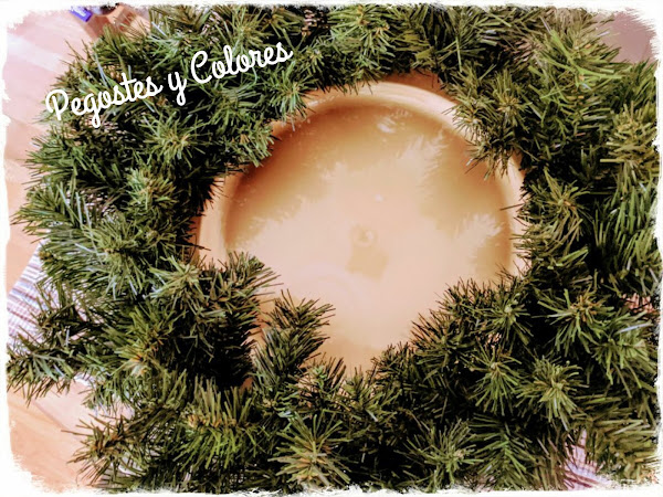 2.- Sobre el plato puse mi corona y le extendí con cuidado las ramas. También acomodo mis bases de vela solo para darme una idea del espacio que tengo y cuanto de listón voy a enredar.
