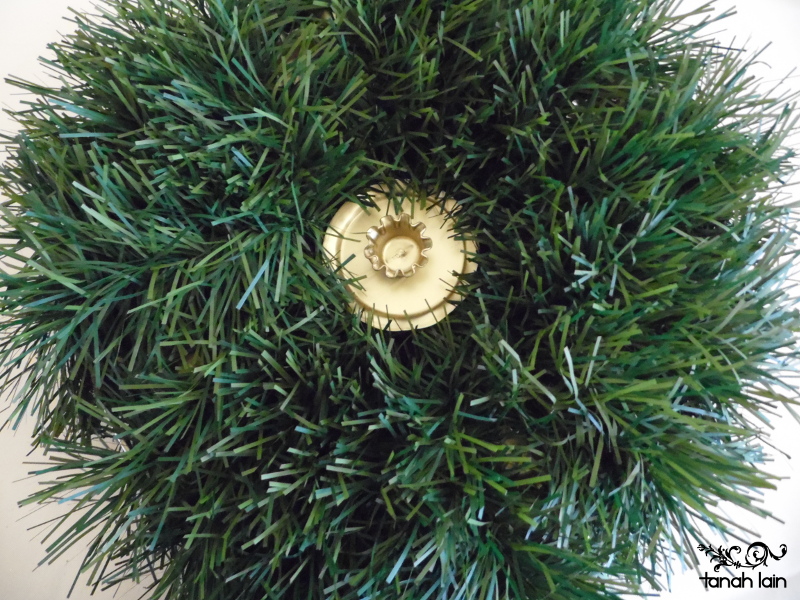 Compre 4 metros de escarcha verde. La cantidad dependerá de que tan grande es la corona que han conseguido. Para colocar la escarcha solo asegure uno de los extremos y luego fui enrollando la escarcha alrededor del aro, pasándola por el centro para que quedara bien forrada. Al final pegue con un poco de silicón. Como ven no esta bien fija, por lo que será fácil quitarle la decoración a la corona y así poder guardarla para otro año. El verde es el color de la esperanza, las hojas de los árboles con las que se realizaban representaban la vida aún durante el invierno, las más comunes eran las ramas de pino y abeto.