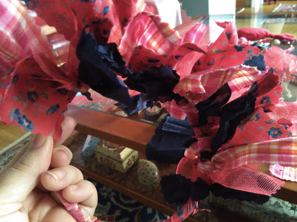 Después de hacer tiras de unos 12 cm por 3 cm con una tijera dentada para que no se deshilache la tela, vamos haciendo nudos alternando las telas de colores que tengamos.