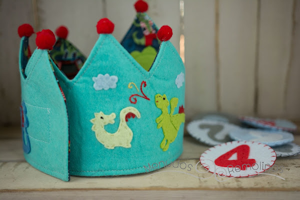 Así que surgió esta corona de cumple que por un lado está llena de dragones preciosos y por el otro una tela combinada de piratas muy originales.