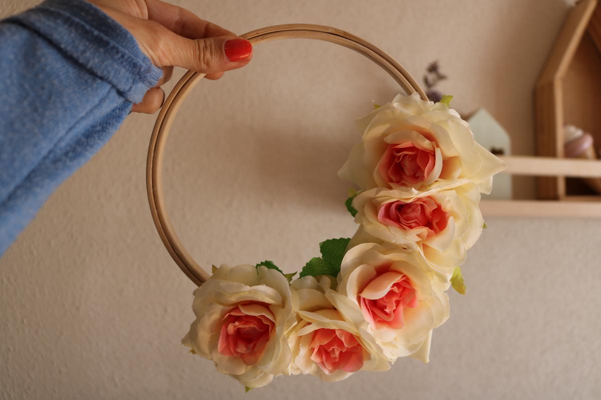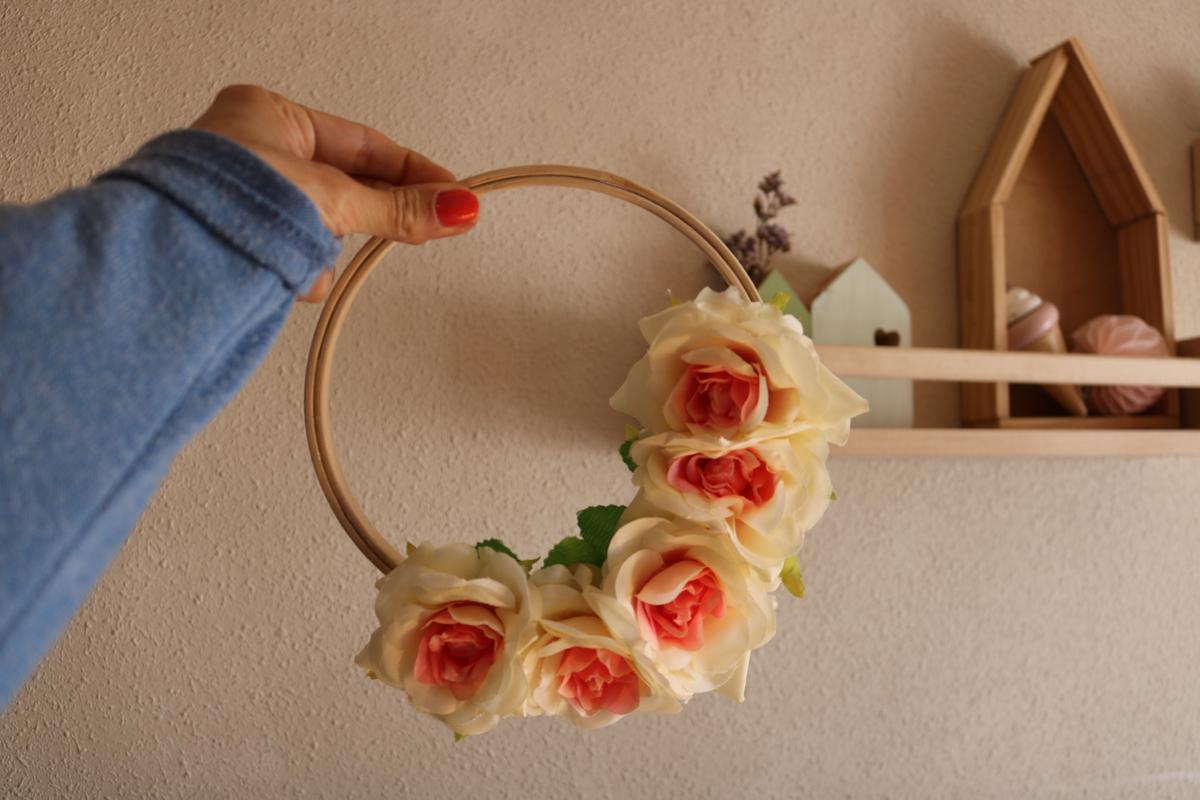 Además de los materiales ser muy baratitos -todos los he comprado en un bazar- el procedimiento es muy sencillo. Sólo necesitáis un aro de madera para bordar, flores artificiales (el color y la cantidad que necesitéis según lo que vayáis hacer) y pegamento de silicona.