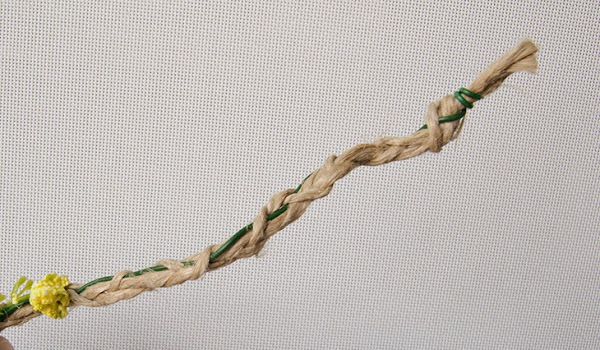 Se trata de hacer una trenza con la cuerda y el alambre fino e ir incorporando por medio las flores y trenzando los rabitos.