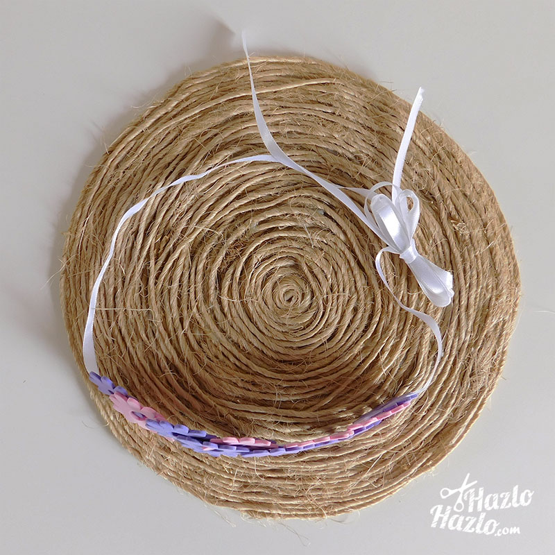 De la misma forma, yo he usado una cinta blanca de raso para hacer mi corona de flores por dos razones; porque combina perfectamente con los colores de mis flores de goma EVA y voy a ser sincera, porque era la que tenía por casa.
