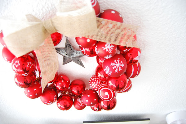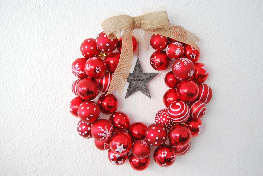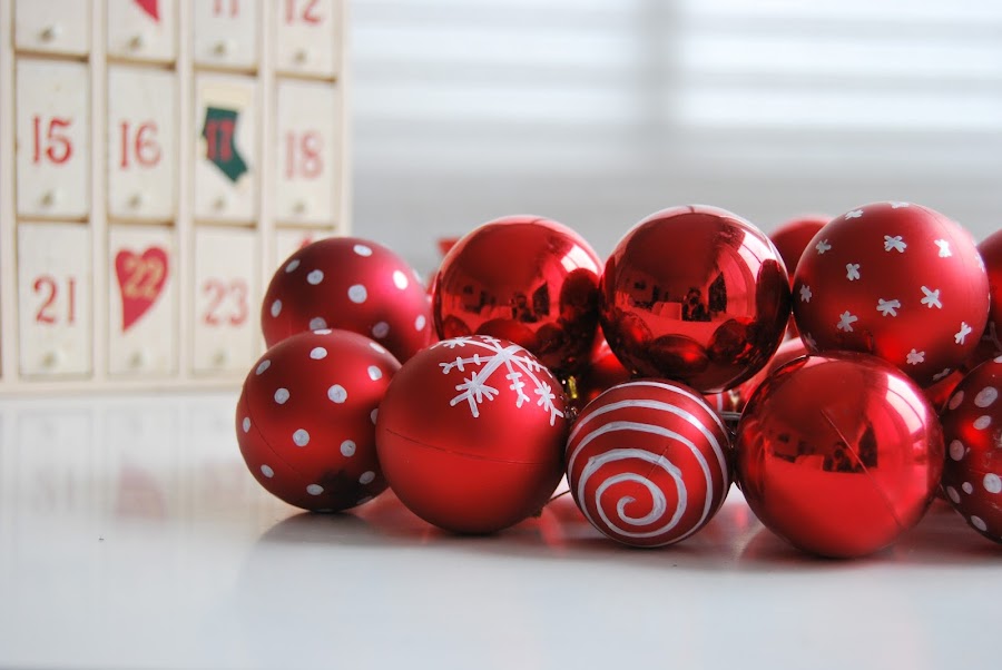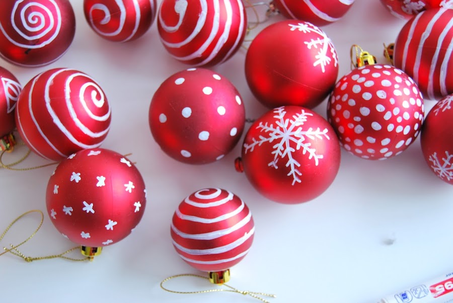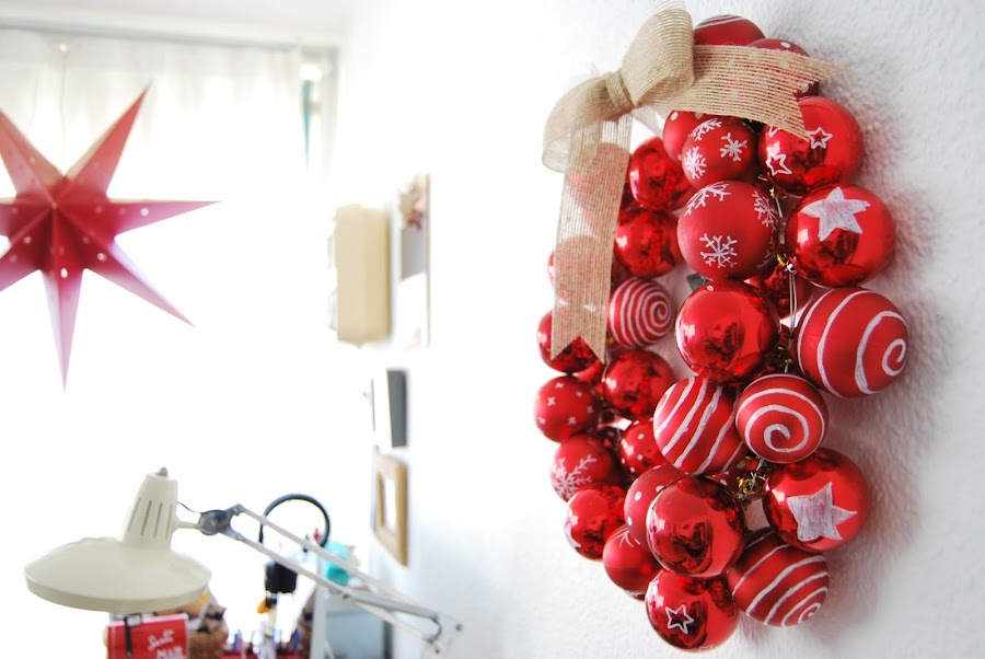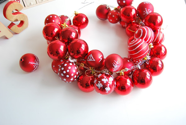 Así que una de estas tardes lluviosas, mi hija y yo nos pusimos a pintar y dibujar motivos "navideños" en las bolas. Empezamos con copos de nieve y lunares y luego llegaron las estrellas y las espirales (mis favoritas, me recuerdan tanto al Dr. Seuss! aunque advierto que son algo más difíciles de dibujar sobre una esfera). Y algunas simplemente quedaron rojas tal cual porque tampoco teníamos muy claro si al montar la corona y iba a quedar muy recargado.